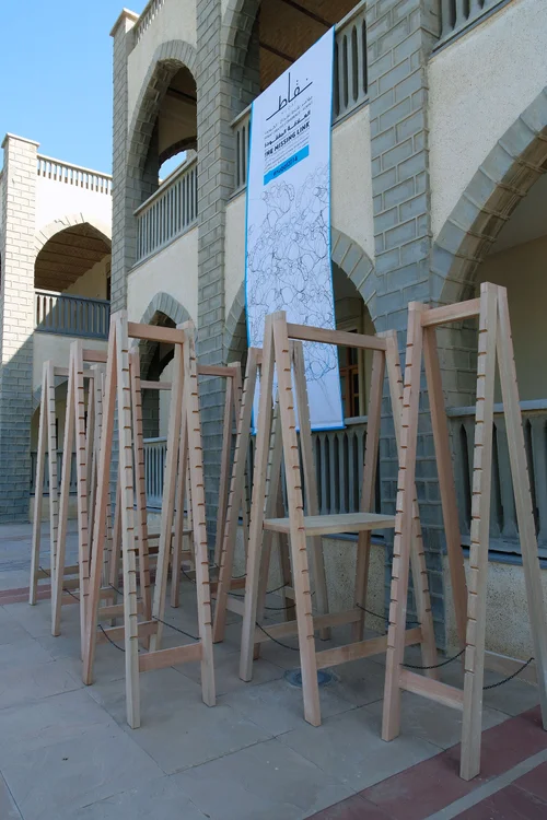 The booth design for project Madeenah consists of a series of folding timber ‘A’ frames arranged to make two partitioning walls that enclose an inner seating area, with shelf spaces for doubled-sided storage and display. The Madeenah booth installed at the Nuqat Design Conference and UNDP’s World Cities Day allowed attendees to examine the methodology behind the Madeenah walking tours, partake in a series of mapping activities and engage with a carefully curated selection of books. The installation was designed to be modular, easily transportable and can be set up in a multitude of configurations for alternate modes of display and use. The ‘A’ frames were later re-used as a shelving system for the Madeenah studio space with custom wooden floating shelves distributed along steel rod supports.