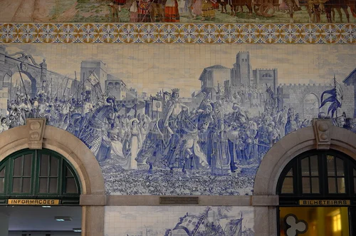 [A woman in her forties kissing her husband good-bye at the train station. In the background appears a neo-classic mural of the Portuguese King (D. João I) who married an English Princess in Porto.]